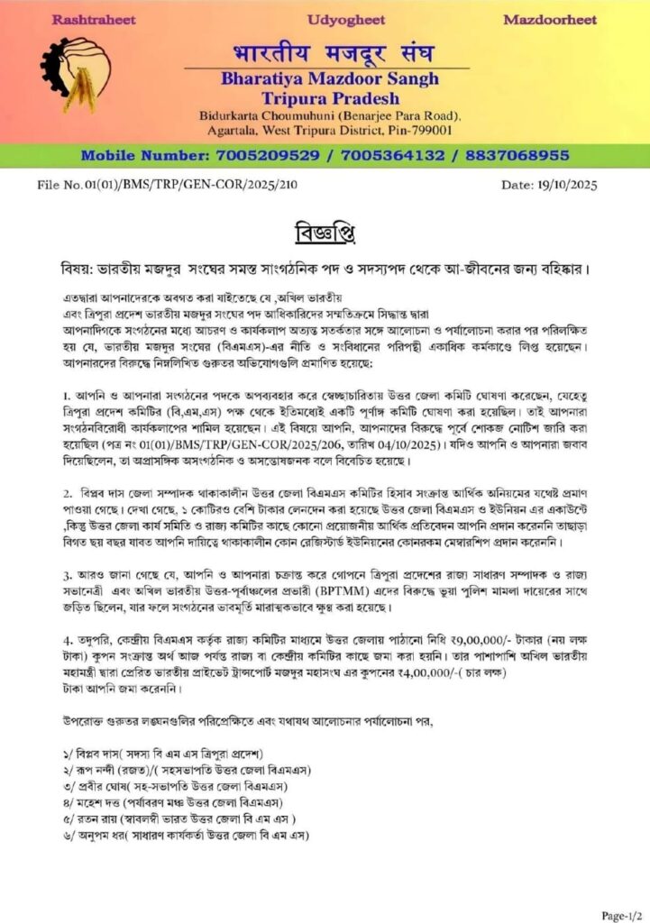 উল্লেখিত ছয়জন সংগঠনের পদকে অপব্যবহার করে স্বেচ্ছাচারিতায় উত্তর জেলা কমিটি ঘোষণা করেছেন, যেহেতু ত্রিপুরা প্রদেশ কমিটির (বি,এম,এস) পক্ষ থেকে ইতিমধ্যেই একটি পূর্ণাঙ্গ কমিটি ঘোষণা করা হয়েছিল। তাই এরা সংগঠনবিরোধী কার্যকলাপে শামিল হয়েছেন। এই বিষয়ে এদের বিরুদ্ধে পূর্বে শোকজ নোটিশ জারি করা হয়েছিল (পত্র নং 01(01)/BMS/TRP/GEN-COR/2025/206, তারিখ 04/10/2025)। যদিও তাঁরা যে জবাব দিয়েছিলেন, তা অপ্রাসঙ্গিক অসংগঠনিক ও অসন্তোষজনক বলে বিবেচিত হয়েছে।