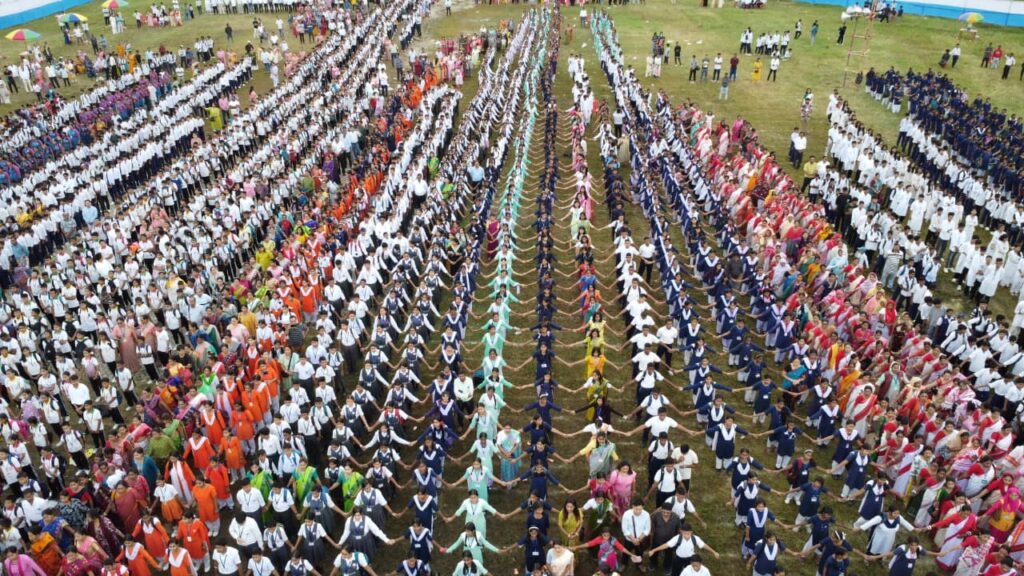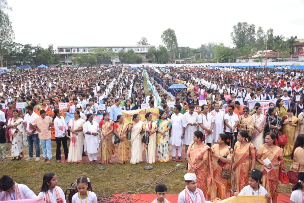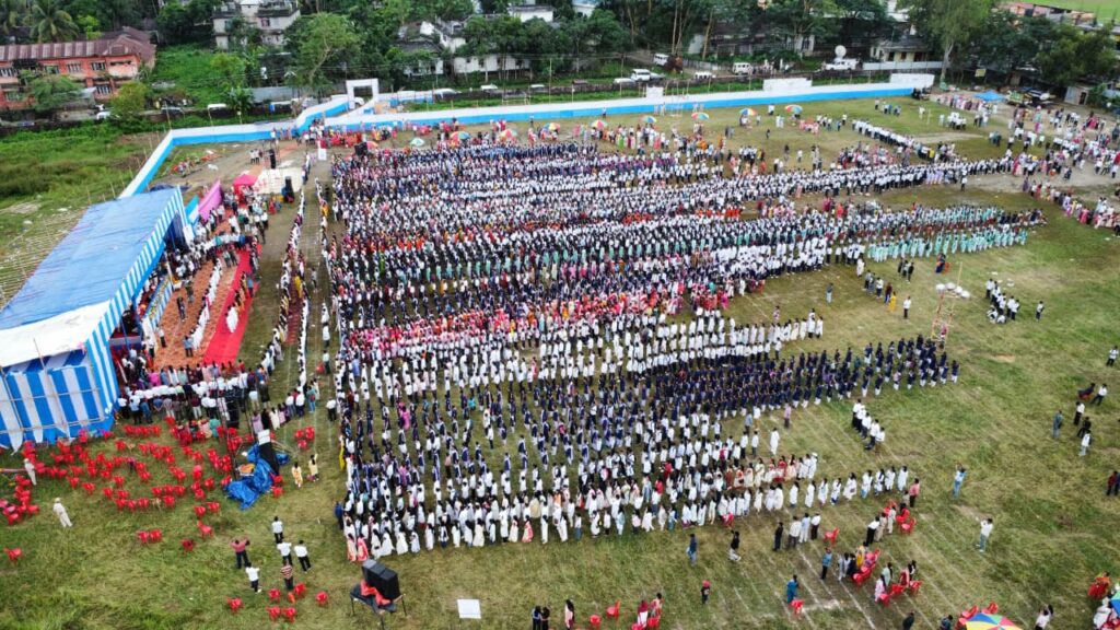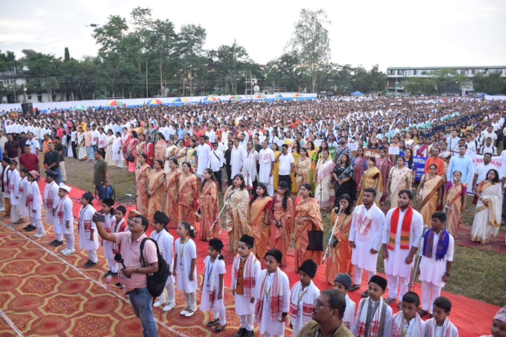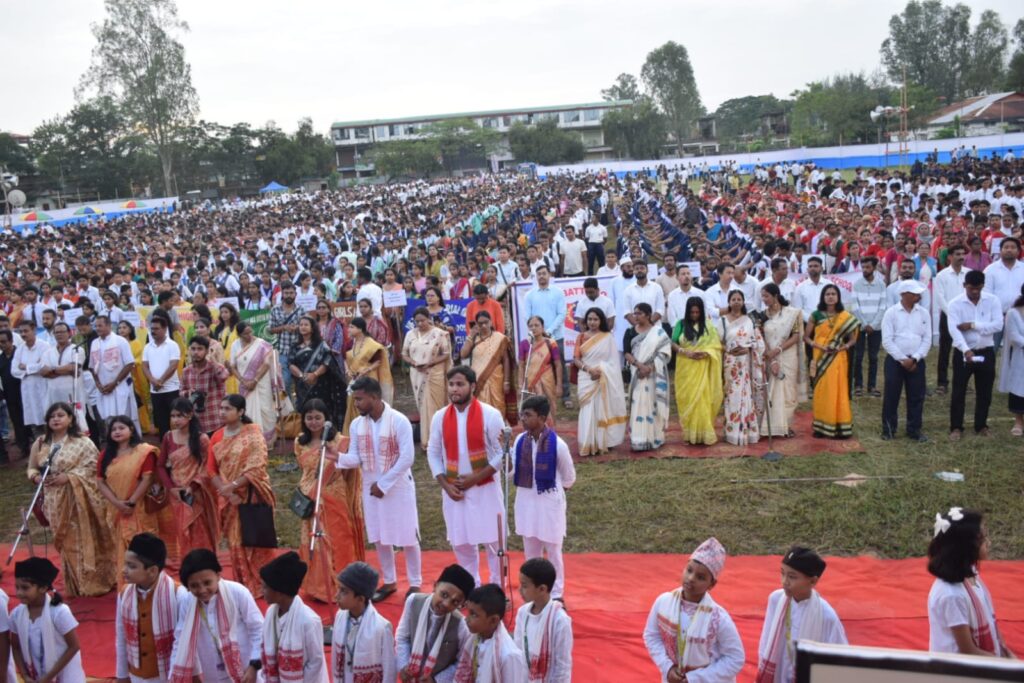 দুপুর তিনটা বাজতেই যেন সুরের ঢেউ ছড়িয়ে পড়ল গোটা মাঠ জুড়ে। ছাত্রছাত্রী, শিক্ষক, চা-বাগানের শ্রমিক, স্বনির্ভর গোষ্ঠীর সদস্য, এনসিসি ও এনএসএস ক্যাডেট, এনজিও প্রতিনিধি, সাংস্কৃতিক সংগঠন ও সরকারি কর্মচারী সবাই একত্রে মিশে গেলেন এক সুরে, এক অনুভবে। গোটা মাঠ জুড়ে প্রতিধ্বনিত হলো ড: ভূপেন হাজারিকার অমর সৃষ্টির ধ্বনি “মানুষ মানুষের জন্য, জীবন জীবনের জন্য”যা যেন এক নবজীবনের আহ্বান হয়ে উঠল।