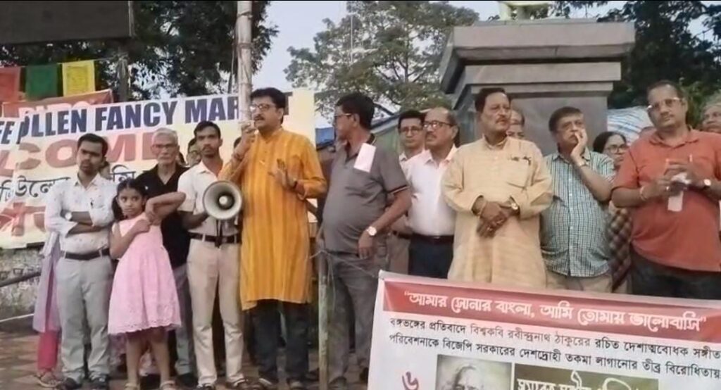 বক্তারা বলেন করিমগঞ্জ জেলার এক রাজনৈতিক সভায় “আমার সোনার বাংলা, আমি তোমায় ভালোবাসি” রবীন্দ্রনাথ ঠাকুরের লেখা এই গানটি গাওয়ার অপরাধে আসামের বিজেপি সরকারের মুখ্যমন্ত্রী উদ্যোক্তাদের বিরুদ্ধে ব্যবস্থা নেওয়ার নির্দেশ খুবই উদ্বেগ জনক। এই গানটি গাওয়াকে দেশের প্রতি অপমান বলে উদ্যোক্তাদের বিরুদ্ধে প্রশাসনিক ব্যবস্থা গ্রহণ গণতান্ত্রিক ব্যবস্থার উপর সরাসরি আক্রমণ।