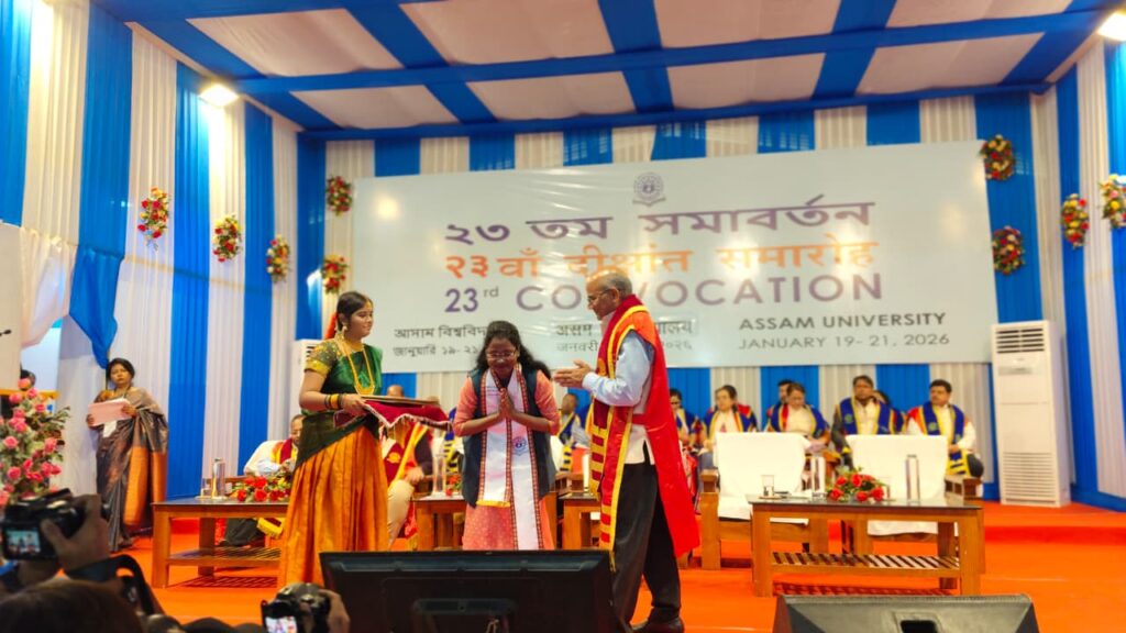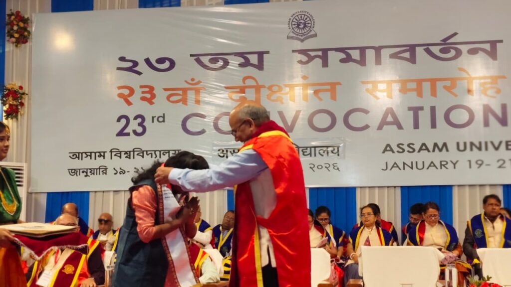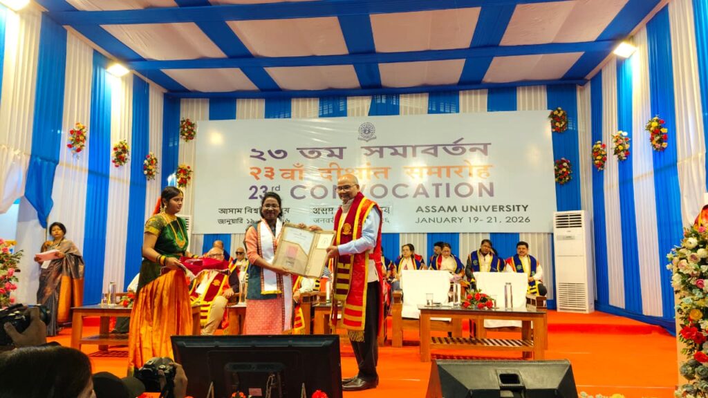 উৎসর্গ রায়, ধর্মনগর, ১৯ জানুয়ারি :- রাজ্যের শিক্ষা জগতে এক গৌরবময় অধ্যায় রচনা করলেন সূচনা নাথ। পরপর দুইবার স্বর্ণপদক অর্জনের মাধ্যমে তিনি রাজবাড়ি, ধর্মনগর, উত্তর ত্রিপুরা তথা সমগ্র রাজ্যকে গর্বিত করেছে। আসাম বিশ্ববিদ্যালয়, শিলচর-এর অধীনে ২০২৩ – ২০২৫ শিক্ষাবর্ষে Department of Education-এর এম.এড. চূড়ান্ত পরীক্ষায় প্রথম শ্রেণিতে প্রথম স্থান অর্জন করে তিনি ১৯ জানুয়ারি ২০২৬ তারিখে বিশ্ববিদ্যালয়ের ২৩তম সমাবর্তনে স্বর্ণপদকে ভূষিত হন। এর পূর্বে, ২০২৪ সালে Vivekananda College of Education থেকে বি.এড. পরীক্ষায় কৃতিত্বপূর্ণ ফলাফলের জন্য আসাম বিশ্ববিদ্যালয়ের ২১তম সমাবর্তনে তিনি স্বর্ণপদক লাভ করেন।