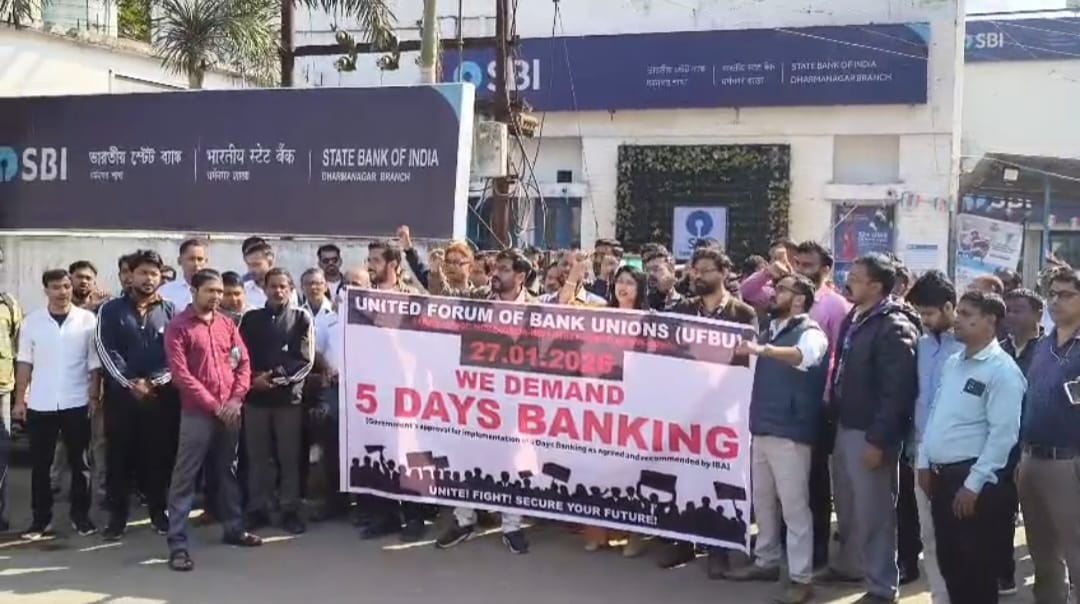 পাঁচ দিনের ব্যাংকিং চালুর দাবিতে ধর্মনগরেও ব্যাঙ্ক কর্মচারীদের জোরালো আন্দোলন