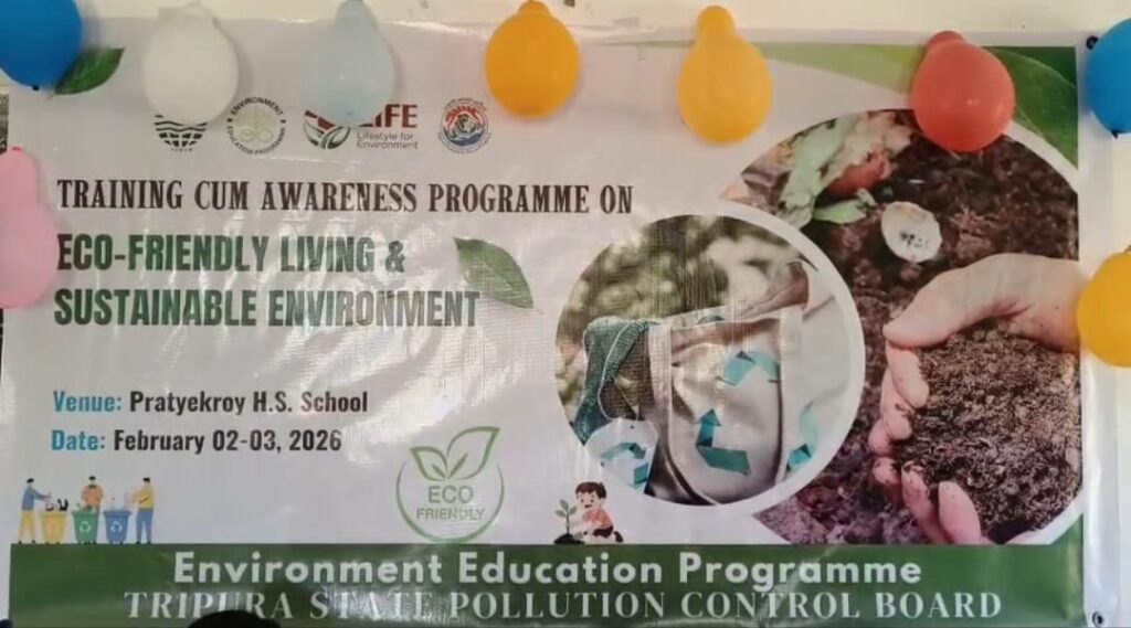 রমেন্দ্র গোস্বামী, ধর্মনগর, ০৩ ফেব্রুয়ারি :- পরিবেশ সুরক্ষা ও টেকসই উন্নয়নের বার্তা নিয়ে উত্তর জেলার অন্তর্গত প্রত্যেকরায় উচ্চ বিদ্যালয়ে শুরু হল দুইদিনব্যাপী “ইকো-ফ্রেন্ডলি লিভিং অ্যান্ড সাসটেইনেবল এনভায়রনমেন্ট” বিষয়ক প্রশিক্ষণ ও সচেতনতা কর্মসূচি। ত্রিপুরা রাজ্য দূষণ নিয়ন্ত্রণ পর্ষদের উদ্যোগে এবং পরিবেশ শিক্ষা কর্মসূচির আওতায় এই অনুষ্ঠানটি অনুষ্ঠিত হয় ২ ও ৩ ফেব্রুয়ারি। অনুষ্ঠানে উপস্থিত শিক্ষার্থী ও শিক্ষক – শিক্ষিকাদের পরিবেশবান্ধব জীবনযাপনের নানা দিক সম্পর্কে বিস্তারিতভাবে অবহিত করা হয়। প্লাস্টিক বর্জ্য ব্যবস্থাপনা, জৈব সার ব্যবহার, বৃক্ষরোপণের গুরুত্ব, জল সংরক্ষণ ও পুনর্ব্যবহারযোগ্য সামগ্রীর ব্যবহার নিয়ে