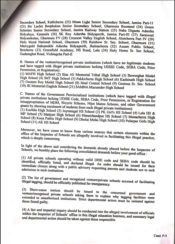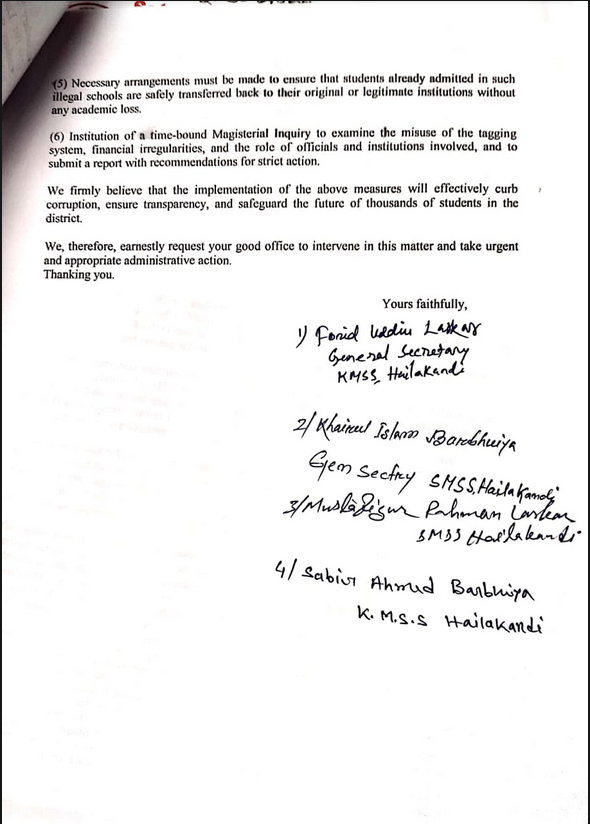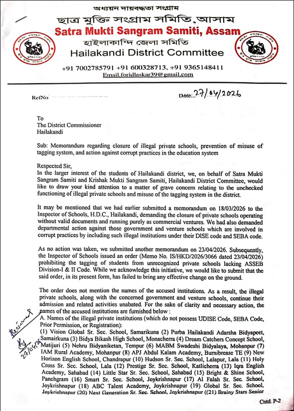 কৃষক মুক্তির নেতা ফরিদ উদ্দিন লস্কর সহ অন্যরা অভিযোগ করেন যে, হাইলাকান্দি জেলার শিক্ষা ব্যবস্থায় এক গভীর ষড়যন্ত্র ও অশুভ আঁতাত চলছে। জেলার বিভিন্ন প্রান্তে ইউ-ডাইস, সেবা কোড এবং হায়ার সেকেন্ডারি কাউন্সিল কোড ছাড়াই অন্তত ৩৫টি বেসরকারি স্কুল কেবল ব্যবসার উদ্দেশ্যে পরিচালিত হচ্ছে। এই অবৈধ স্কুলগুলোকে সুবিধা পাইয়ে দিতে জেলার ১১টি সরকারি স্কুল তাদের নিজস্ব কোড ব্যবহার করতে দিয়ে ‘ট্যাগিং’ বাণিজ্যে লিপ্ত হয়েছে। এই প্রক্রিয়ার মাধ্যমে মিড-ডে মিল, সরকারি সাইকেল এবং ‘নিযুত মইনা’র মতো জনকল্যাণমূলক প্রকল্পের বিশাল অঙ্কের টাকা আত্মসাৎ করা হচ্ছে বলে অভিযোগ উঠেছে। এই ব্যাপক আর্থিক ও প্রশাসনিক দুর্নীতির রহস্য উদ্ঘাটন করতে সংগঠনের পক্ষ থেকে অবিলম্বে একটি উচ্চপর্যায়ের ম্যাজিস্ট্রেট তদন্ত নিশ্চিত করার জন্য অতিরিক্ত জেলা আয়ুক্তের কাছে জোর দাবি জানানো হয়েছে।